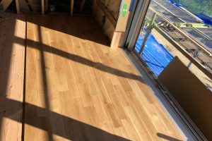 床板は、”無垢のナラ材”を使用しています。 一枚一枚きつく締めすぎると、無垢材の性質状、板の反りが発生する場合があるので、少し隙間を開けながら、貼って行きます。 残りも、丁寧に貼っていきたいと思い…