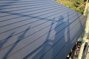 入江板金さんに屋根を貼っていただきました。 いつも丁寧な仕事ありがとうございます。 大工仕事の方は、、 外部のボードを貼り終え、サッシを取り付けています。