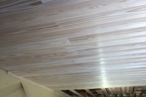 天井を貼り終わりました 杉の”目透かし板”を使用しています。