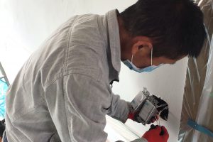 河内電気工事さんがフェザーフィールが塗り終わった壁や腰板部分などにコンセントやスイッチを組んでいます。
