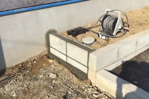 内装工事と並行して外構工事も進んでいます。 コンクリートの洗い出し仕上げや板塀の柱建て作業中です。