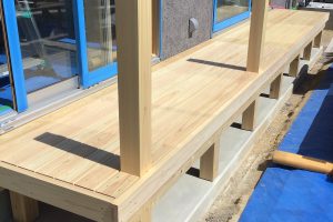 ウッドデッキ製作中です。 骨組みは桧の90mm角で天板も同じく桧の厚み30mmの板を少し隙間を空けて張っています。
