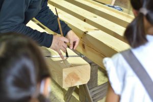 赤木棟梁が階段の地松ササラ桁を加工しています。こちらのお宅はストリップ階段(蹴込板が無いタイプ)なので、開放的な階段になる予定です。お子様も興味津々で見守ってくれました。 一般的な「普通」の階段は集成材などを工場で機械が…