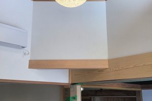 ダイニングからの吹き抜けの仕上がりです。壁漆喰のハケ仕上げ、天井は杉板張り、古材を表して勾配に仕上げました。照明器具がきれいです。
