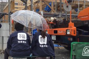 こんにちは。 今年は例年よりずいぶん早い梅雨入りでしたが、梅雨の晴れ間に上棟日を迎えました。 作業は順調ですが、天気が曇りから徐々に回復傾向のはずが、なかなか晴れ間が見えません…。 昼前くらいでようやく天気が回復して屋根…