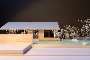 こんにちは。 ブログ木曜担当の小沢です。 今回の模型は焼杉板の平屋です。 28坪程のコンパクトな平屋で、4人家族想定です。 玄関は東側です。外壁を白くしてアクセントにしています。 南西は隣地の駐車場なので木製フェンスと植…