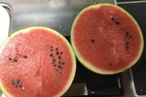 毎年、最高の甘さと美味さを体感させていただいております。 大玉の西瓜に包丁を入れた瞬間にサクッと割れていきます。いい音と甘い香り、甘くて美味しい西瓜の映像は、いかがでしょうか。 西瓜にかぶりついて、ハーモニカを吹いている…