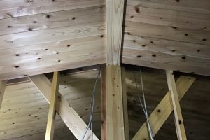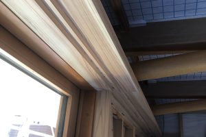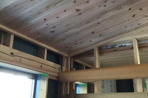 天井の杉板(本実12mm厚)を張り終わりました。リビング、ダイニング、寝室等は、勾配天井になっています。いちばん高いところで床から3mあり、大きな空間になっています。次は、廻り縁(天井と壁の見切り)を取付けていきます。