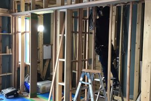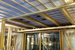 窓枠、入口枠の取付けが終わりました。 次は断熱下地・天井下地をしています。 天井は平天井(天井面が水平になったもの)で少し天井高さを低く設定しているので仕上がれば落ち着いた良い雰囲気になると思います!