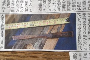 400年近い時代を経て、人の目に触れた大工道具ということになるのでしょうか。 今の時代に大工たちが使っている、「のみ」と同じ形はしていますが、現代で主流になっている片刃ではなく、両刃のようです。いずれにしても、当時の大工…