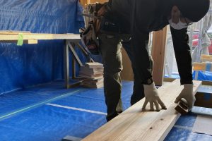 断熱工事が終わりました。床の断熱は大引間にセルロースファイバーを吹き込み、今回は付加断熱として根太間にフェノールフォームを敷設しています。 高性能断熱材で一度に断熱するよりも少し手間がかかりますが、断熱材に木材が入る事に…