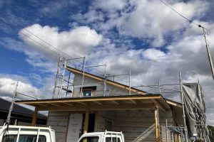 室内大工工事の真っ最中。 建具枠の取付後、天井下地に取り掛かっています。 少しずつ空間の大きさが実際仕上がるサイズ感に近づいてきたので、暮らしのイメージが湧きやすくなりました。 外部では、左官屋さんが外壁のそとん壁を綺麗…