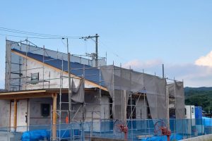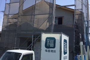 外壁そとん壁のかき落とし仕上げが終わりました。 綺麗な味のある表情に仕上がりました。森本工業所さんお疲れ様でした。 内部ではユニットバスの据付けが終わりました。