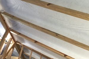 断熱材 デコスドライ工法『セルロースファイバー』 新聞紙を木の繊維まで戻して再利用しているので調湿性に優れ、木造建築、自然素材の家に最適です。天井、壁の断熱材の下地を施工しています。
