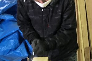 石本棟梁が天然乾燥された地松材を手刻みしています。 石本棟梁と一緒に小林棟梁も地松の手刻みをすすめています。地松に刃物が入るたびに独特のいい香りが工房の作業場全体に広がっていきます。 棟梁が手刻みした地松材と美作檜で組み…