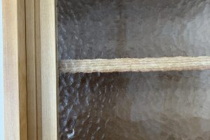 今回の木製オリジナルキッチンのバックカウンターにおもしろいガラスが使われています。かつては、このようなガラスがとてもたくさんの種類の中から選ぶ事ができたのですが、今は、余り生産されなくなってしまいました。 大量生産される…