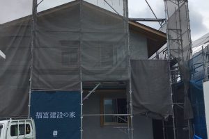 外部軒天の下地作業中です。仕上げは杉板を張ります。 内部では、床下の電気配線・エアコン配管・給排水設備等の作業中です。