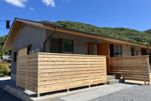 11日の日曜日まで、完成見学会を開催中の二世帯テラスハウスからの眺めです。南側に大きく開いた窓から、大きく広がる緑を眺めることが出来ます。そして、何より、大きく突き出た木製の軒先が緑の眺望とマッチしています。
