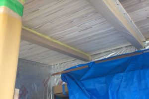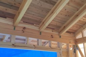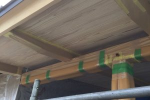 軒天に杉板(本実12mm厚)を張っています。板の色を合わせてバランス良く張っていきます。
