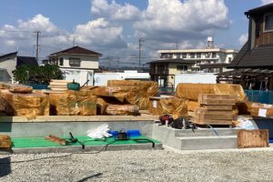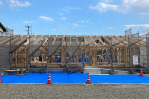 先月の上棟からもうすぐ1ヶ月。工事も順調に進んでいます。 次はサッシの木枠を取付けて、外壁下地を進めていきます。