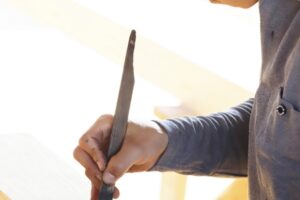 まさに手作業、一本一本の木材に墨で手刻みするための印をつけていきます。静かな、しかし、真剣に集中することを必要とされる作業です。