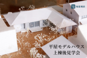 11/29(水)にいよいよ新モデルハウスの上棟を行います。 その直後の土曜日に「平屋モデルハウス上棟後見学会」を開催します! 【日 時】12/2(土)①10:00 ②14:00 【場 所】福富建設リビングギャラリー隣 平…