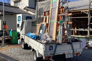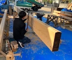 あの大きな木材を加工していきます。 どこに組み合わさるのかは上棟までのお楽しみです。