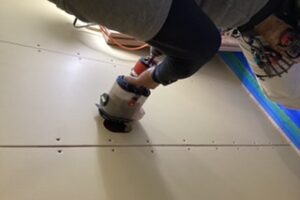 スイッチ、コンセント 開口を電気屋さんが施工しています。電動工具を使用し、きれいな仕上がりです。