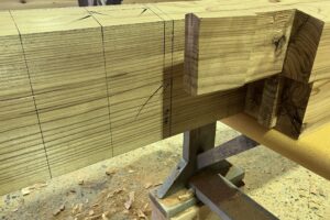 モデルハウス上棟に向けて手刻み加工をしています。 写真にある細工は鎌継ぎという継手です。 墨付けされた材料を手道具を使って加工していきます。