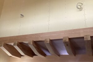 ダイニングの天井と2階の床を受ける為に無垢の桧材の30センチ角を使いました。その上に杉の梁を455mmピッチで組んでいます。 杉の梁の間に見えているのは杉の2cm厚の天井板です。 斜めに落とした先は吹き抜けになっている、…