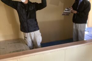東洋工材の中務さんに現場に来て頂きました。 ハンガーパイプ・可動棚の金物・室内の物干金物などを1箇所ずつ寸法取りをして注文させて頂きました。