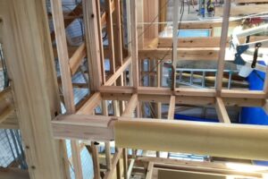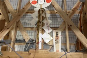 入口枠 天井下地などを施工しています。天井の仕上がりは杉板張り、節無し 節有りの仕上がりです。