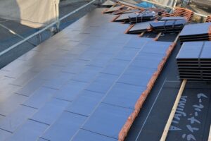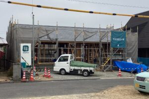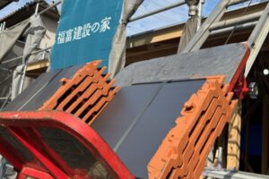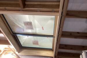 上棟から1ヶ月ほど経ちました。 屋根に瓦がのりました。 平板瓦なので、すっきりとしています。 外壁はサッシを取り付けています。 次は室内の床を貼る準備をしていきます。