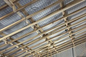 天井下地をしています。天井の仕上がりは杉板張りです。 見えなくなる下地ですが下地を綺麗に作れば最後の仕上がりも良くなります。 今日は左官屋さんが玄関の巾木を仕上げてくれました。仕上げは砂利の洗い出しになります。 いつもの…