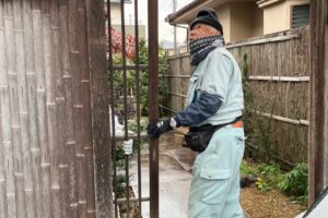大工暦50年以上、福富建設の最年長棟梁、城谷さんが、30年近く使用している門の木製建具を修理しているところです。いつもながら、手際よく、段取りよく、仕事が進んでいきます。