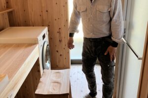 洗面台を使用される奥様のご希望で石本棟梁が奥様専用の椅子を製作しました。 細部にいたるまで、使い勝手のいいように工夫されています。 石本棟梁ならではの手仕事です。
