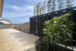 デッキ廻りの植栽が終わりました。焼板の塀に新緑が映えます。高台にあるので気持ちの良い居場所になりました。 リビングから良く見える所に、デッキを切り欠き水がめとアオキを配置しています。田中棟梁が紫陽花の高さをお客様と相談し…