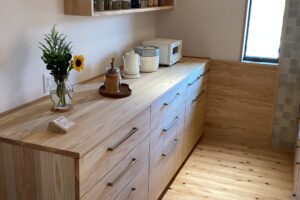 外構工事も終わり、先日お引渡しをしました。 杉板で塀をしました。 裏から入れるように扉もついています。 建物と板塀がとても合っていますね。 トイレのペーパーホルダーを作ってみました。