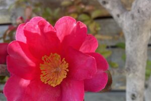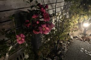 暖冬とは言え、気温の下がる日の入り後のギャラリーの植栽の中で綺麗に咲いている華があります。「冬の華」と聞いて、高倉健さんの渋い演技とクロードチアリの哀愁溢れるギターの音色を思い浮かべるのは、昭和世代だけでしょうか。