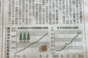 国内の木材の自給率がこの数年、回復してきているそうです。海外からの木材の調達が困難になったことも大きな原因でもあるようです。 その他に燃料用として木材が利用される事が増えたようです。再生可能エネルギーとして注目される木質…
