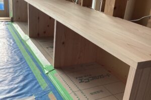 松井木工さんからキッチンが届きました。 河内電気さんと配線を納めながら組んでいきました。 リビング側は収納になっています。 扉は杉で、木目も綺麗に通っています。