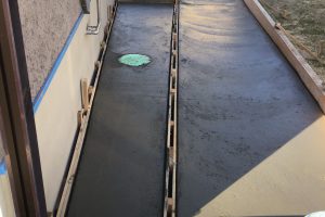駐車スペースやアプローチはコンクリートの洗い出し仕上げになります。 今日は午後からコンクリート打ちの後コテ押さえです。一晩寝かせて明日洗いをかけます。