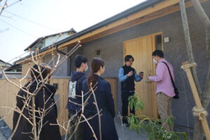 こんにちは小沢です。 春らしく暖かい日が増えてきました。 前回に続いて白い平屋でも植栽をします。 今回はみんなで貼る芝も準備しています。 今回植えてもらうのはイロハモミジ、ハイノキ、ウメモドキなど。 敷地と道路の段差は石…